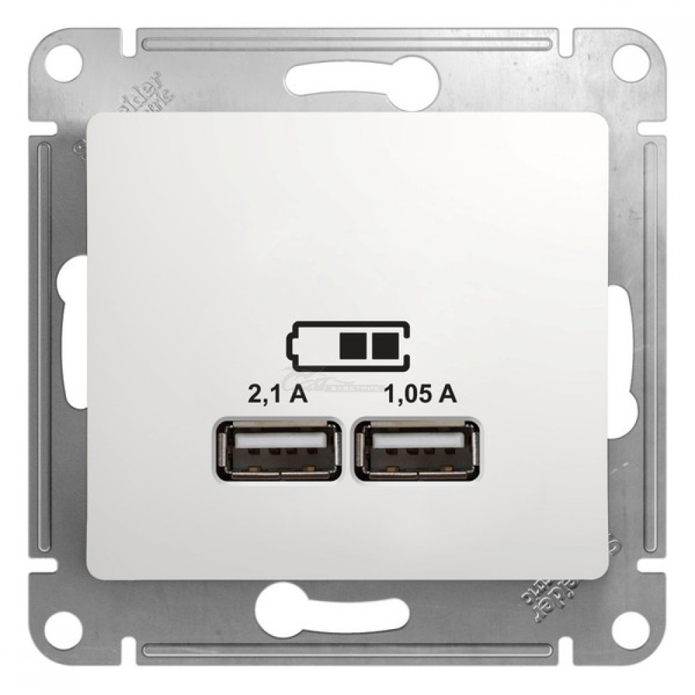 Механизм Schneider Electric Glossa (цвет белый) розетки с двумя разъёмами USB с выходными напряжением 5 В постоянного тока и выходами с номинальным током по 2,1 А.