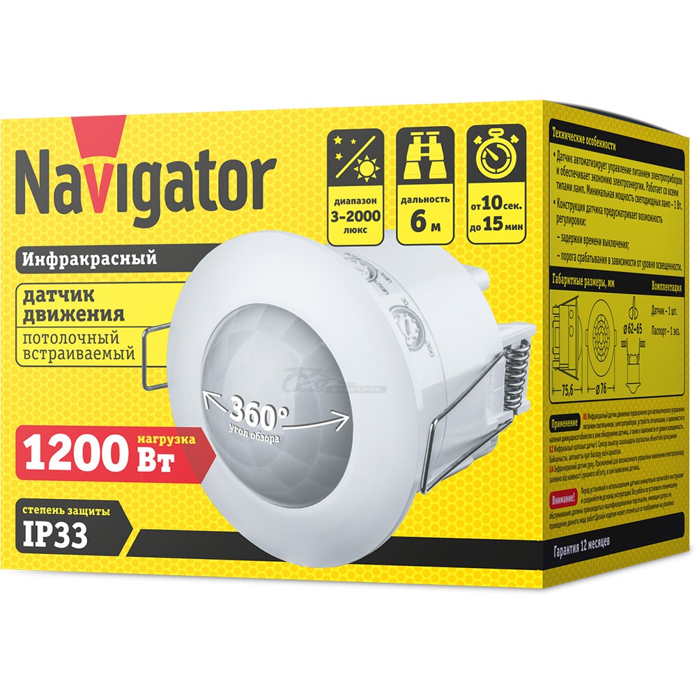 Датчик движения NS-IRM07 встраиваемый 1200Вт 360гр. 6м IP20 белый Navigator