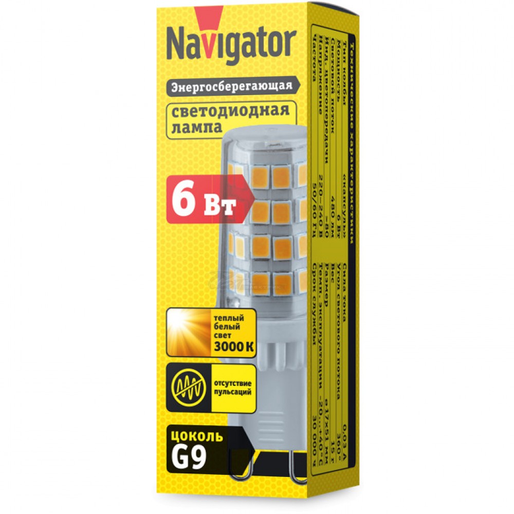 Лампа светодиодная Navigator NLL-P-G9 6W 3000K 480лм 220V 17х51мм без пульсаций