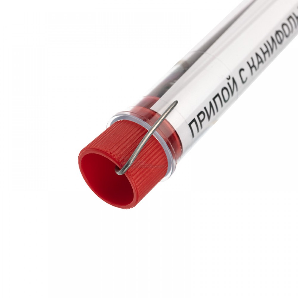 Припой с канифолью REXANT представляет собой проволоку (диаметром 1 мм) из сплава олова (61 %) и свинца (39 %). Используется в пайке для соединения деталей между собой и позволяет создать герметичный, механически прочный (устойчивый) шов. Нагреваясь до температуры плавления (183...188 °С) припой: расплавляется, смачивает спаиваемый металл и, растекаясь по нему — заполняет место между соединяемыми деталями.