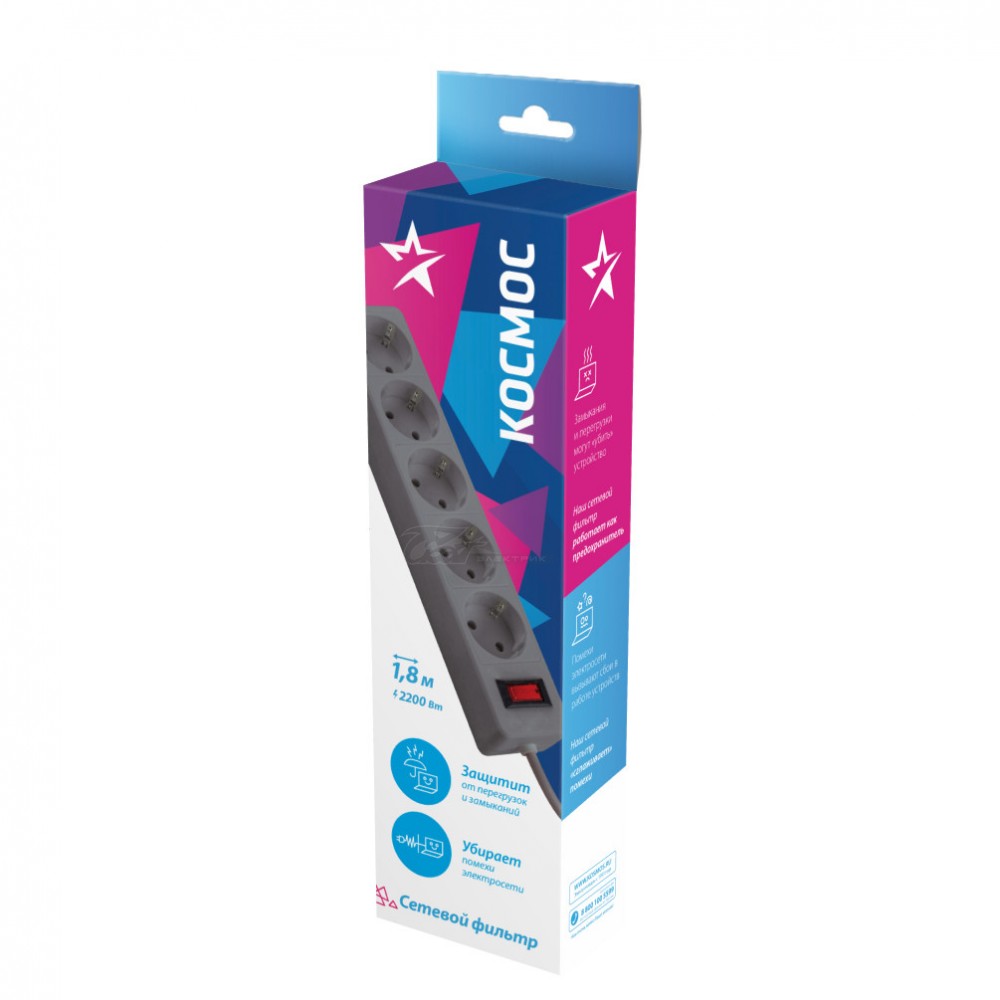 Фильтр сетевой Космос 1,8м 5роз.серый 10А 2,2кВт (ПВС 3х0,75)