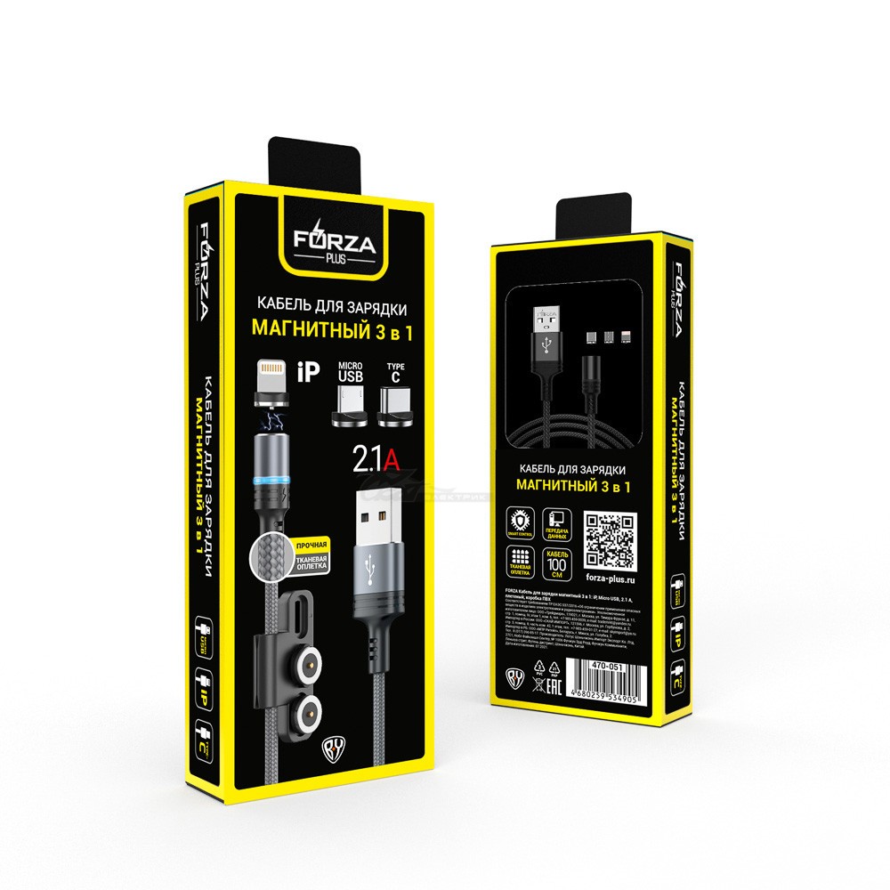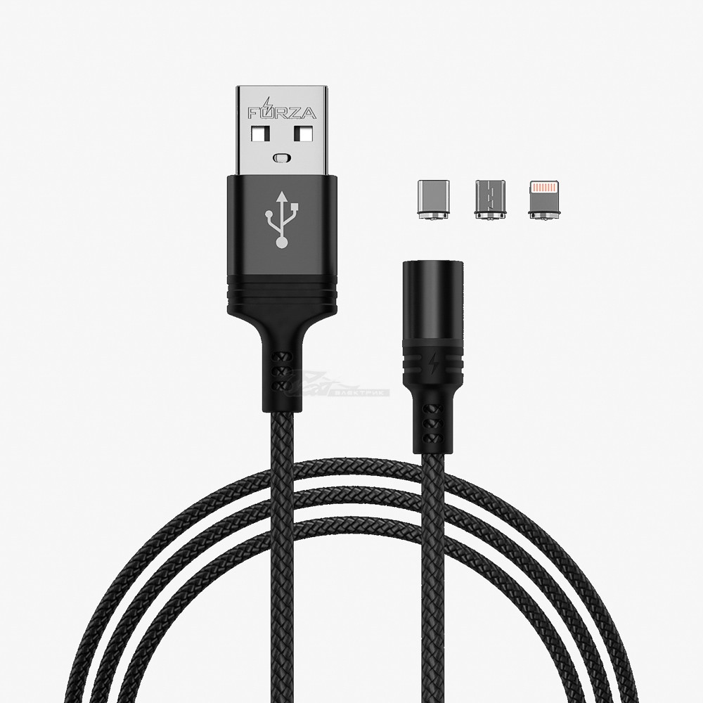 Шнур USB 2,1A для зарядки магнитный (USB-typeC/microUSB/Lightning) 1,0м прорезиненный FORZA