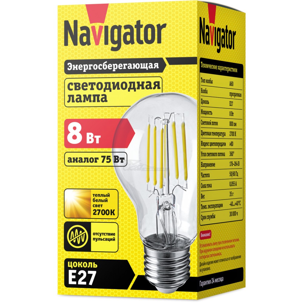 Лампа светодиодная филаментная А60-8W E27 220V 2700K CL Navigator