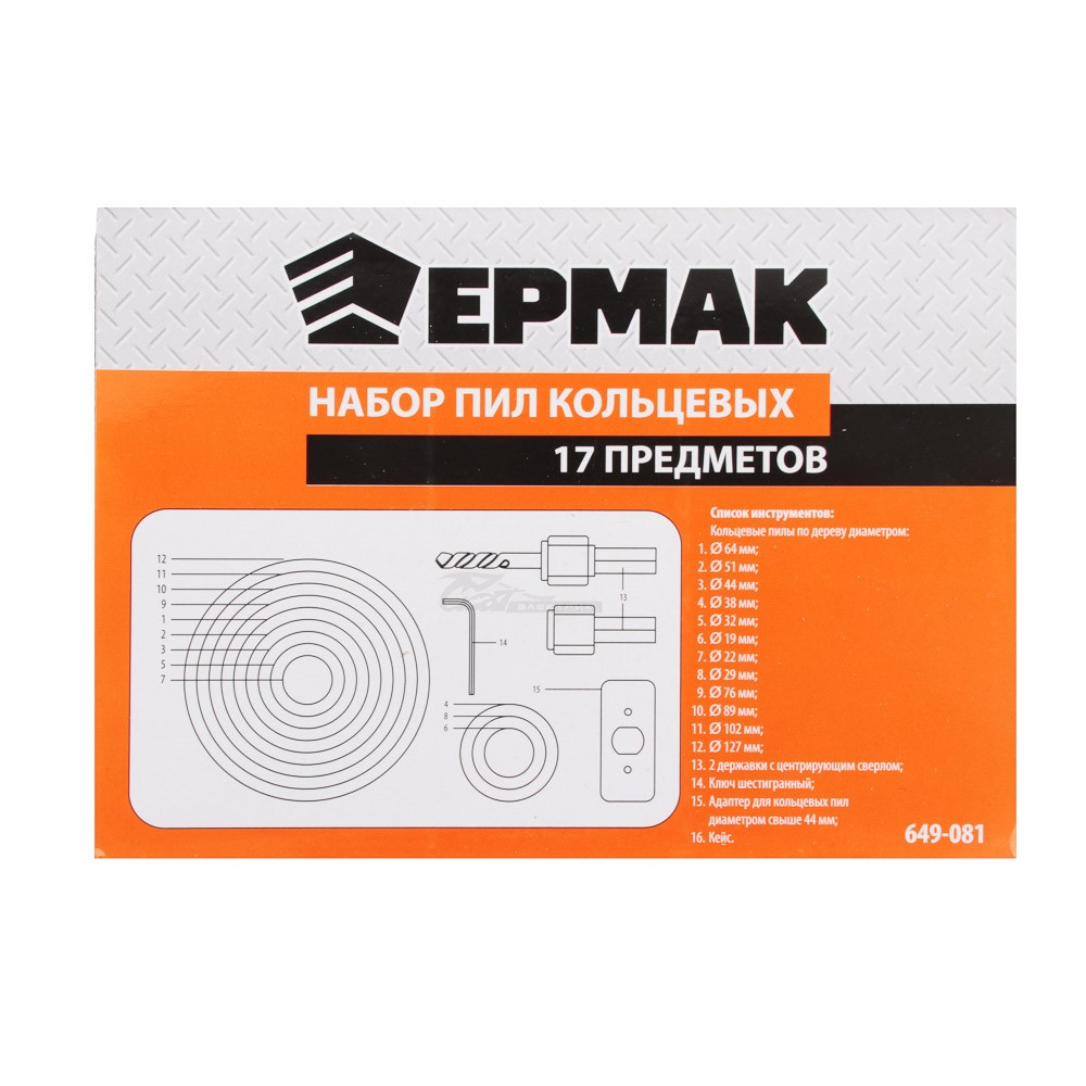 Набор кольцевых пил ЕРМАК из 17 предметов предназначен для высверливания круглых отверстий в древесине различных пород и твердости, гипсокартоне, фанере, ДСП, металле, кирпиче, бетоне и прочих материалах. Используется совместно с дрелями. Диаметр отверстий от 19 до 127 мм. В набор также включены сверла, шестигранный ключ, адаптер для кольцевых пил диаметром свыше 44 мм. Набор поставляется в пластиковом кейсе.