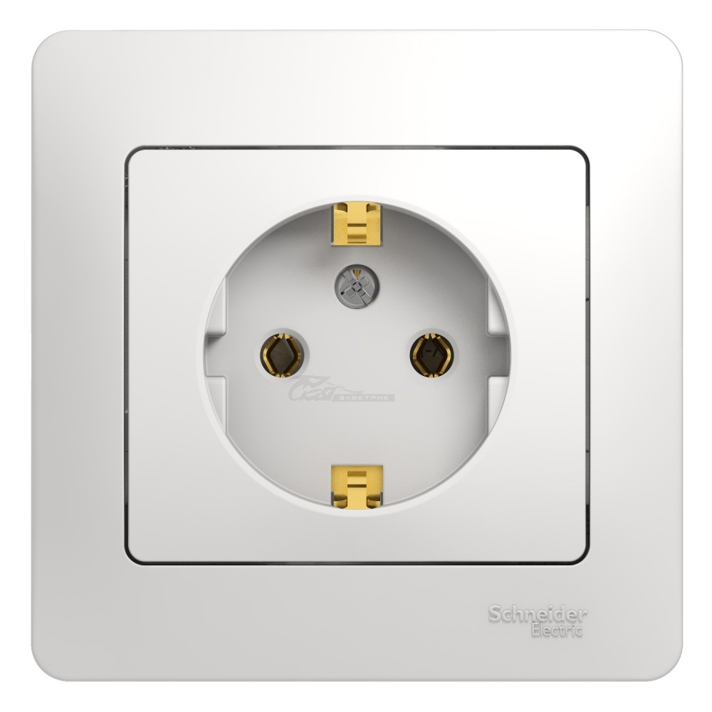 Розетка Schneider Electric Glossa (в сборе, цвет белый) одинарная без заземления и без шторок подходит для сетей 250 В, на ток 16 А. - Выполнен из материала PС+ASA, стойкого к УФ-излучению и появлению царапин. - Эргономичные клеммы розеток расположены в один ряд.