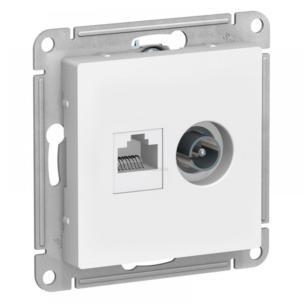 Механизм Schneider Electric AtlasDesign (цвет белый) двойной розетки разъёмами RJ45 категория 5е и TV предназначен для удобного и быстрого подключения вашего компьютера и телевизора к соответствующим сетям. - Пластик с ионами серебра в белом цвете обеспечивает антибактериальный эффект. - Лицевые детали из качественного ABS-пластика, устойчивого к царапинам и УФ-излучению. - Усиленные прямые монтажные лапки для лучшей фиксации механизма в монтажной коробке.
