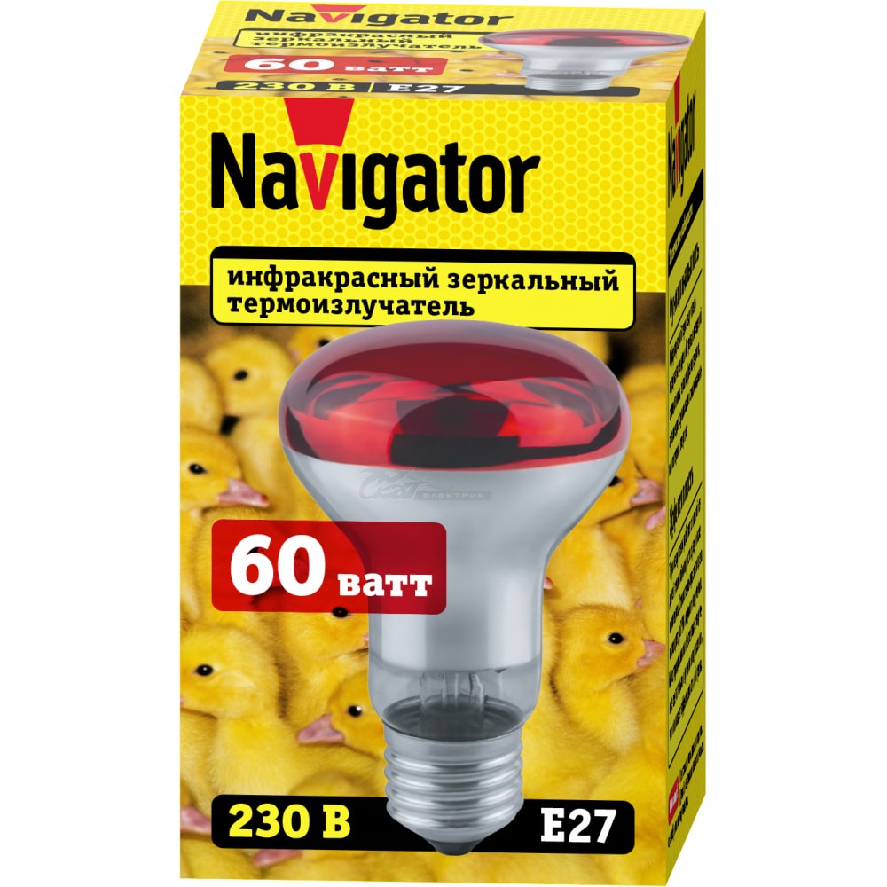 Инфракрасные зеркальные термоизлучатели Navigator серии NI-ИКЗК предназначены для обогрева помещений с животными, теплиц, физиотерапии, а также для сушки лаков и красок. Конструкция лампы обеспечивает излучение света только в нужном направлении, что повышает эффективность обогрева. Стекло темно-красного цвета
