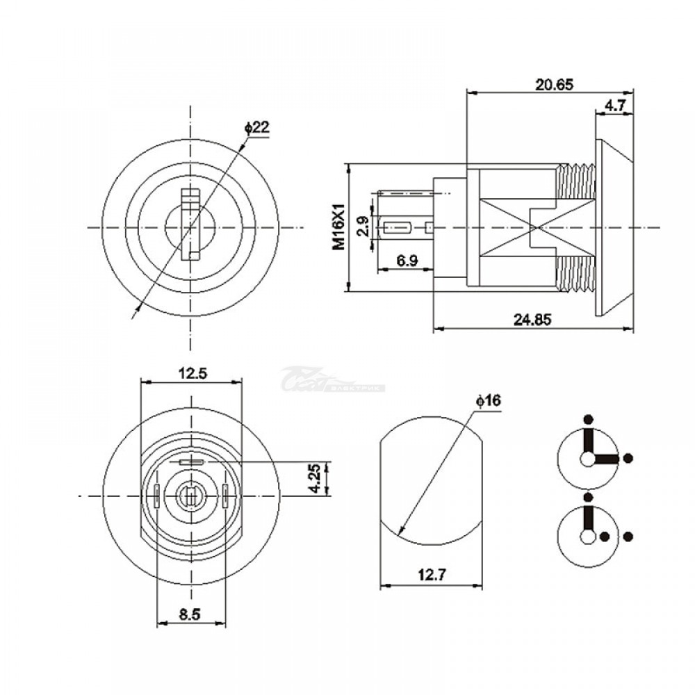 Выключатель ключ Ø16 250V 2А (3с) ON-ON предназначен для коммутации электрических цепей переменного тока напряжением 250В.Для переключения в нужное положение установите ключ (поставляется в комплекте) и приложите некоторые усилия на него. Монтаж осуществляется без применения винтов на плоских панелях толщиной от 0.8мм до 3мм. Подключение контактов осуществляется с помощью пайки.