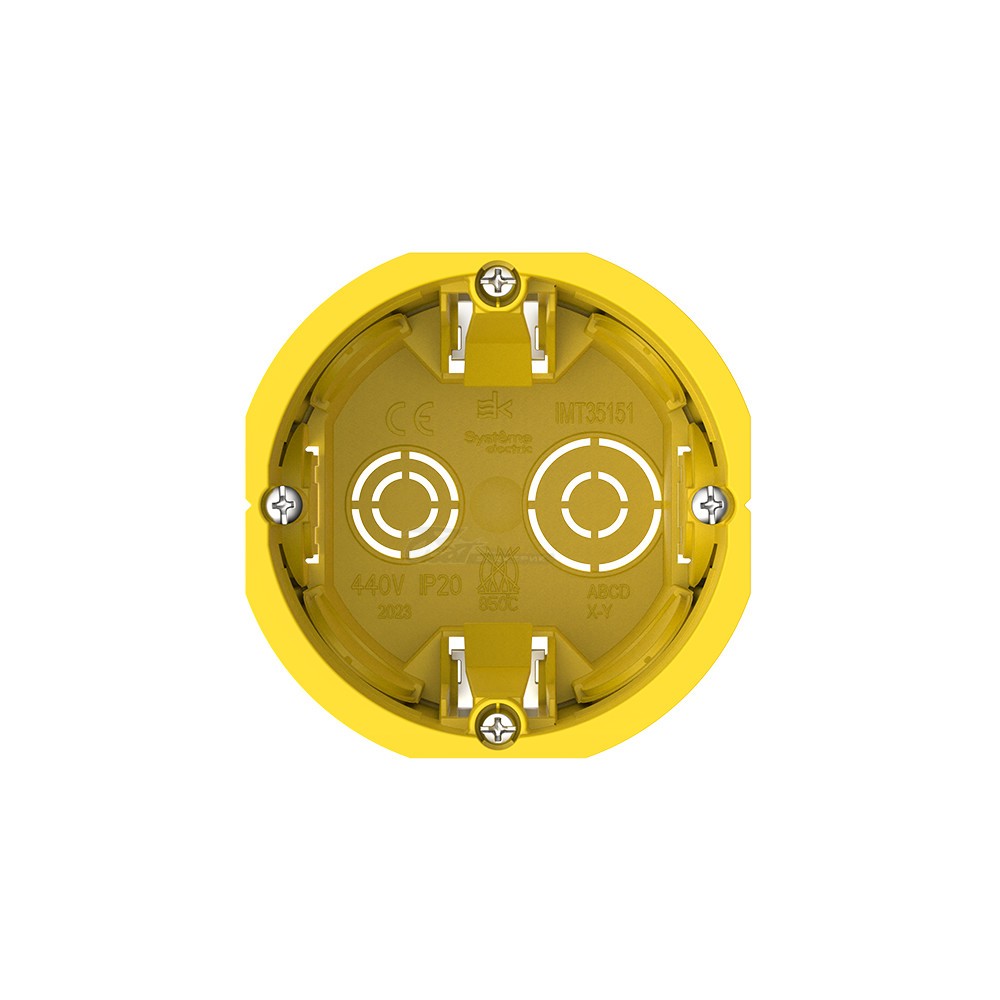 КОРОБКА УСТАНОВОЧНАЯ ДЛЯ ПОЛЫХ СТЕН, например, из гипсокартона. Размеры: наружный диаметр - 68 мм, внутренние размеры - диаметр 65 мм, глубина 60 мм, цвет-жёлтый. Имеет широкие металлические лапки для крепления. Трехзаходные винты ускоряют монтаж коробки. Обжимка на концах винтов препятствует потере лапок при транспортировке и монтаже. Огнестойкость -850 °С. Степень защиты - IP20. Для соединения коробок в группы используется соединитель IMT35180/IMT35182.