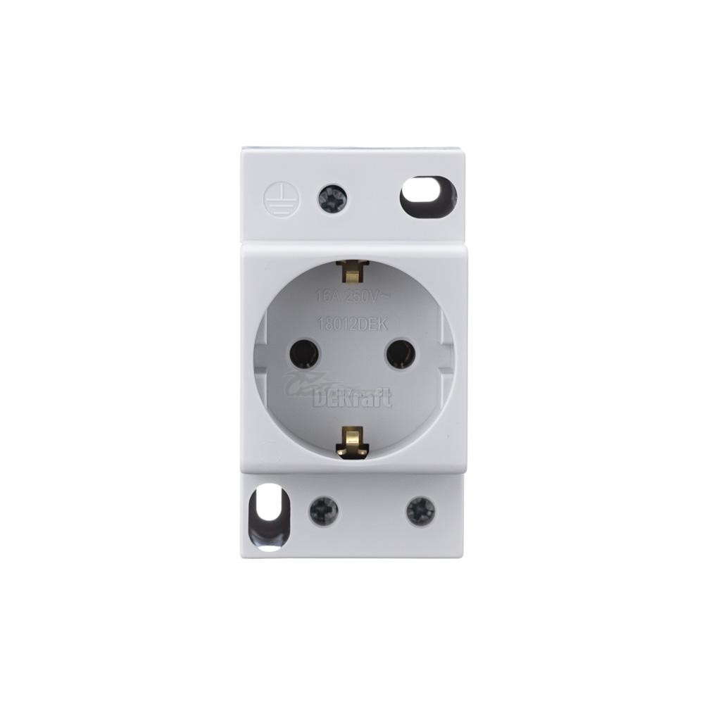 Розетка модульная серии РМ-102 Dekraft; ном.ток – 16 А; с заземляющим контактом; ширина – 45 мм; установка – на DIN-рейку; установочное положение – любое; степень защиты – IP20. Розетка модульные предназначены служит для подключения переносных светильников или электрического инструмента малой мощности во время профилактических и ремонтных работ в электрической сборке по месту установки.
