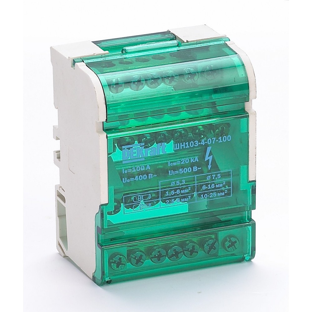 Кросс-модуль серии ШН-103 DEKraft; номинальный ток - 100 А; исполнение – 4 ряда по 7 отверстий (5х5,3 + 2x7,5); материал корпуса – нагревостойкий пластик; материал шин – высококачественная электротехническая бронза; каждая шина отдельно изолирована; цвет крышки – зеленый; установка – на DIN-рейку 35 мм или на монтажную панель двумя винтами M4; степень защиты - IP20. Применение кросс-модулей в щите обеспечивает компактную разводку кабелей и защиту от прикосновения к токоведущим частям.