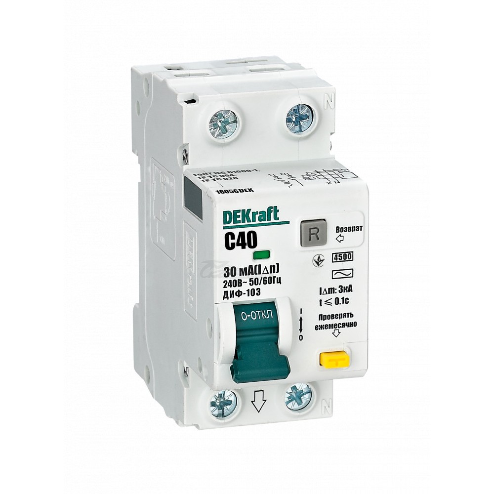 Автоматическими выключателями дифференциального тока серии ДИФ-103 Dekraft; 1N+P; номинальный ток 40 А; ном.дифф. ток 30 мА; тип дифференциального расцепителя - AC; кривая отключения - С; на DIN-рейку. АВДТ (автоматическими выключателями дифференциального тока) сочетают функции автоматического выключателя и УЗО (ВДТ), обеспечивают три вида защиты — от короткого замыкания, перегрузки и возникновения утечки тока (в частности, вследствие прикосновения человека к токоведущим частям). АВДТ с отключающей способностью 4,5кА применяются в распределительных, учётно-распределительных, телекоммуникационных щитах и др. в жилищном, гражданском строительстве, сельском хозяйстве, инфраструктуре объектов промышленности.