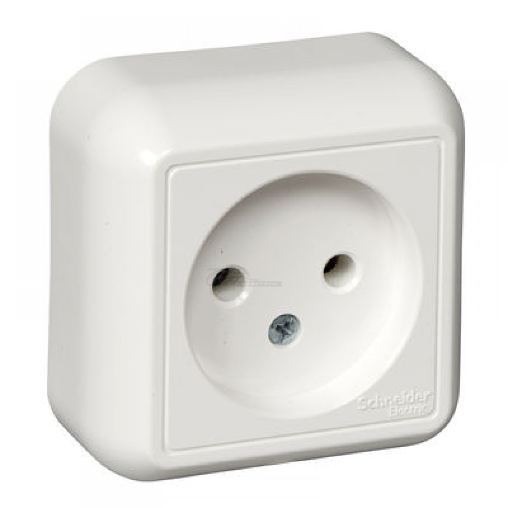Розетка Schneider Electric ПРИМА (открытой установки, цвет белый) без заземления и без шторок, с монтажной стальной пластиной предназначена для сетей до 250 В на ток до 10 А.